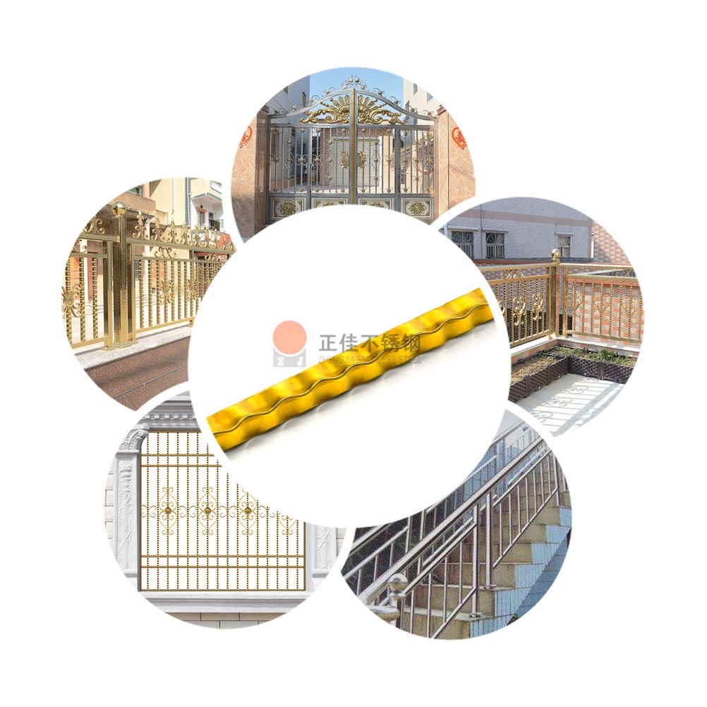 本款產(chǎn)品是新型的藝術(shù)不銹鋼花紋管,不銹鋼管通過(guò)機(jī)壓工藝壓出波浪花紋然后表面作鈦金電鍍處理。廣泛應(yīng)用于各種防盜網(wǎng),大門,欄桿等。